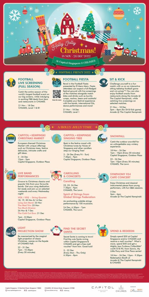 This Christmas season, join us for an amazing yuletide experience where you can catch snowfall, carolling & concerts and be mesmerized by a magical light projection of classic Christmas scenes on the facade of CHIJMES Hall! There will also be live music performances from your favourite bands featuring Christmas classics and popular hits over at Capitol Singapore! Programme for carolling and live band performances: A Holly Jolly Time – Carolling & Live Band Performances – Capitol Singapore